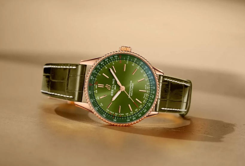 The Navitimer Automatic 36 comes in a green dial with a matching outer slide rule, making for a single-color dial. It’s powered by the time-only automatic Breitling Caliber 17. The midsize 36 mm case diameter hits a sweet spot for those who’d like a smaller watch with a sleek time-only layout. The top clone watches is fitted to a dial-matching green alligator strap with a red gold tang-type buckle.